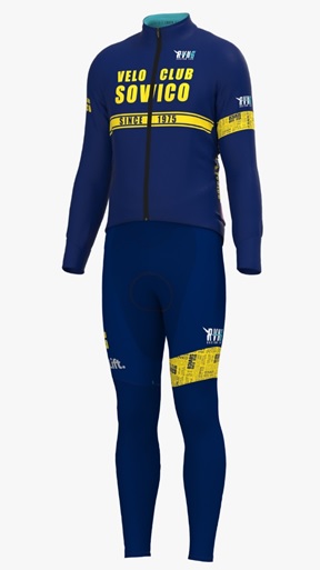 Il giallo ed il blu come da tradizione saranno i colori dominanti. Il logo Velo Club Sovico si impone sul fondo giallo, leggermente più sotto la dicitura “Since 1975” a sottolineare la storicità del sodalizio.